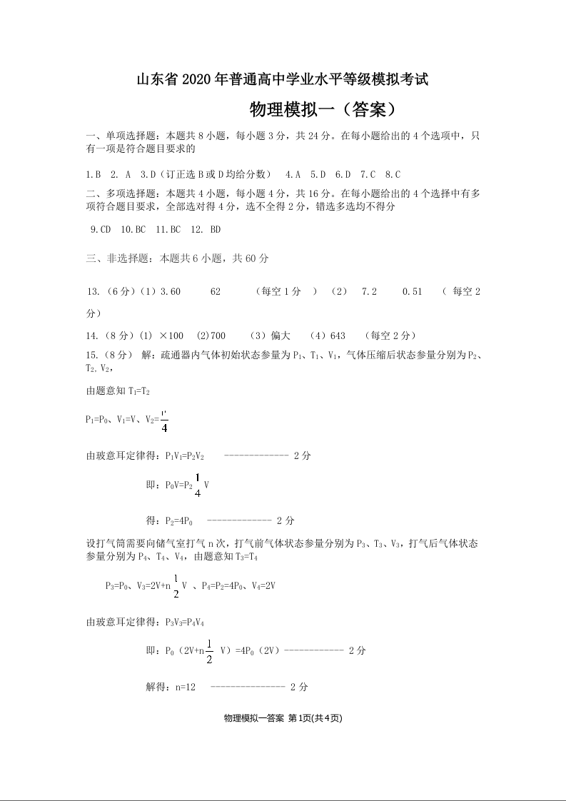 山东省九地市2020.12高三年级阶段性检测物理答案