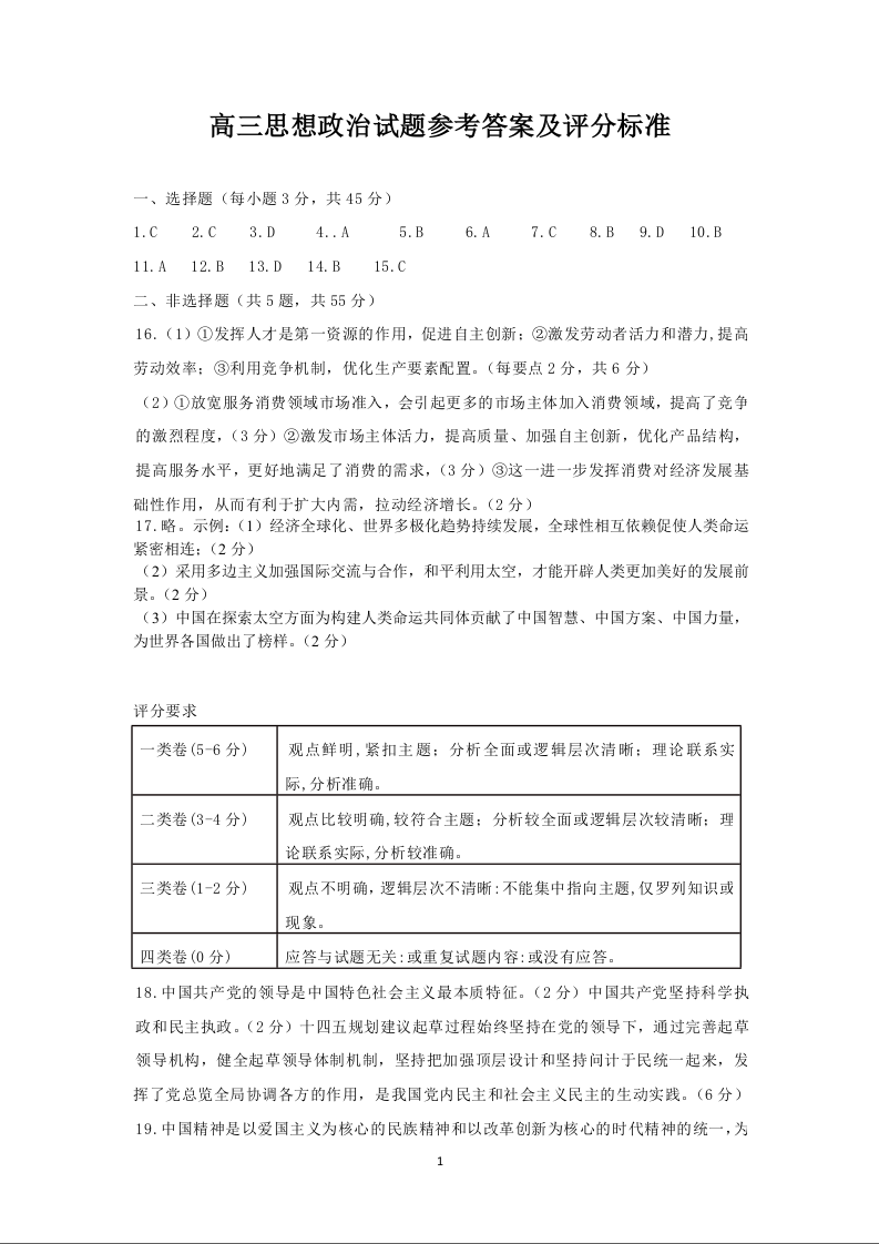 山东省九地市2020.12高三年级阶段性检测政治答案