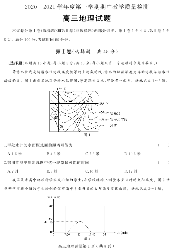 山东省聊城市局部2020.11高三年级期中教学质量检测地理试题及答案