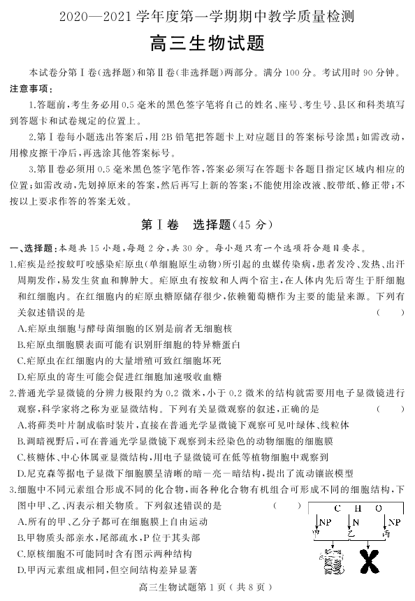 山东省聊城市局部2020.11高三年级期中教学质量检测生物试题及答案