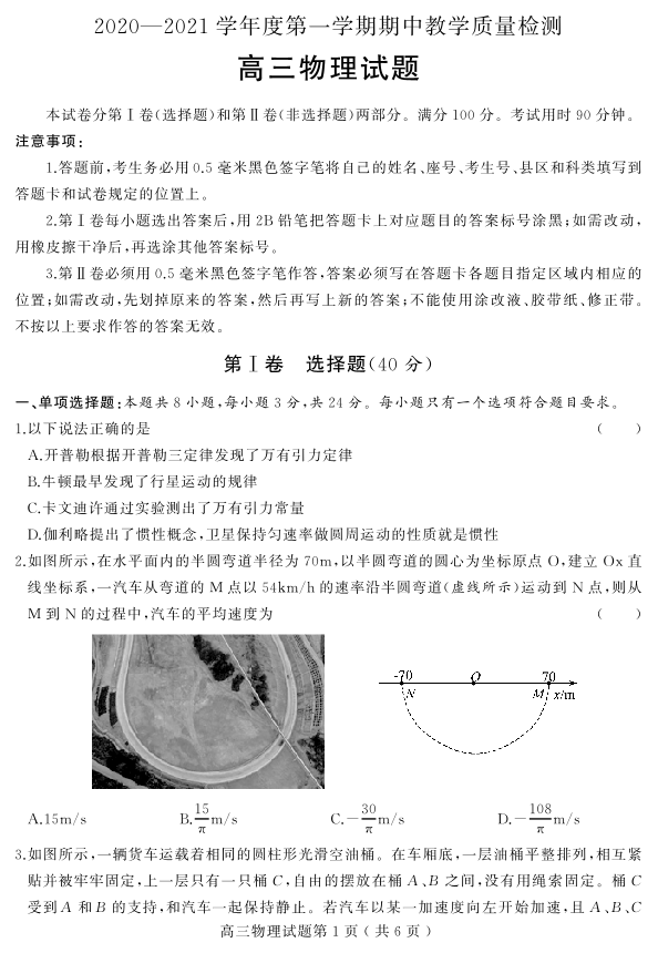 山东省聊城市局部2020.11高三年级期中教学质量检测物理试题及答案