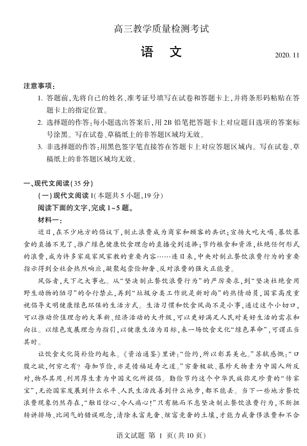 山东省临沂市2020.11高三年级期中教学质量检测语文试题及答案