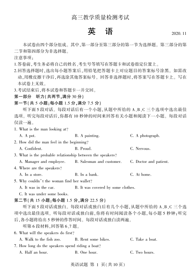 山东省临沂市2020.11高三年级期中教学质量检测英语试题及答案