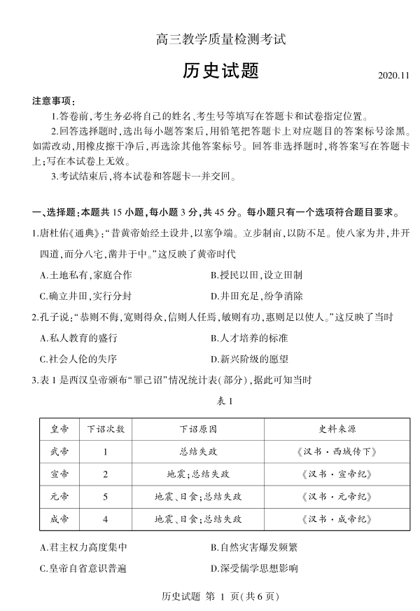 山东省临沂市2020.11高三年级期中教学质量检测历史试题及答案