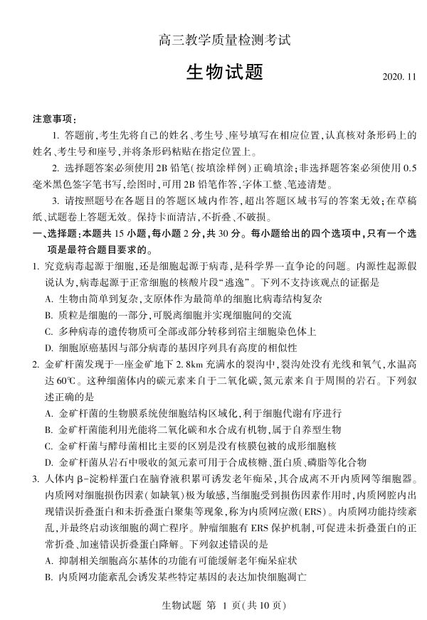 山东省临沂市2020.11高三年级期中教学质量检测生物试题及答案