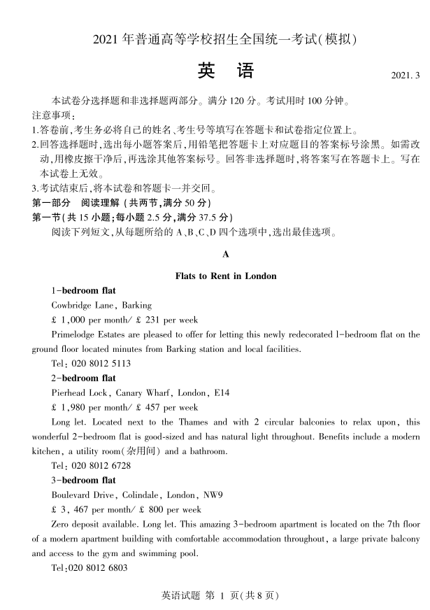 山东省临沂市2021.3高三年级第一次模拟考试英语及答案