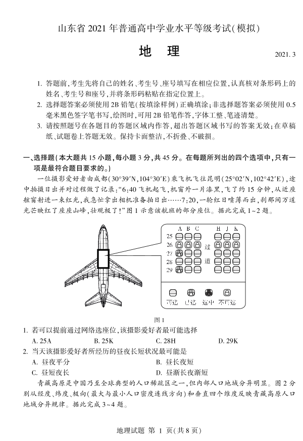 山东省临沂市2021.3高三年级第一次模拟考试地理及答案