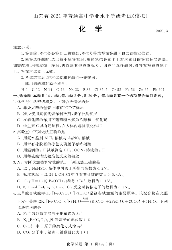 山东省临沂市2021.3高三年级第一次模拟考试化学及答案