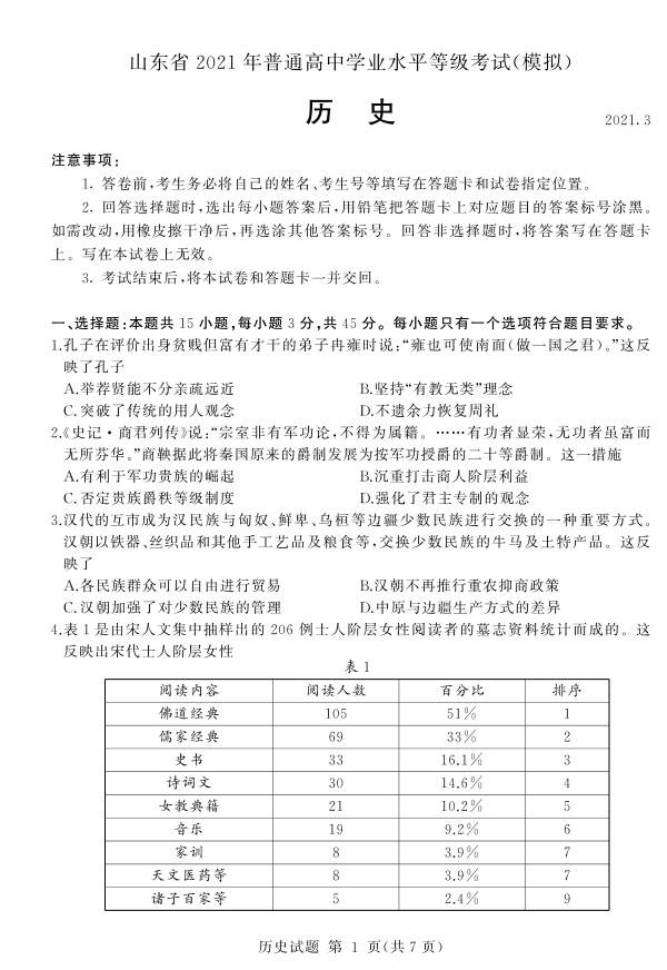 山东省临沂市2021.3高三年级第一次模拟考试历史及答案