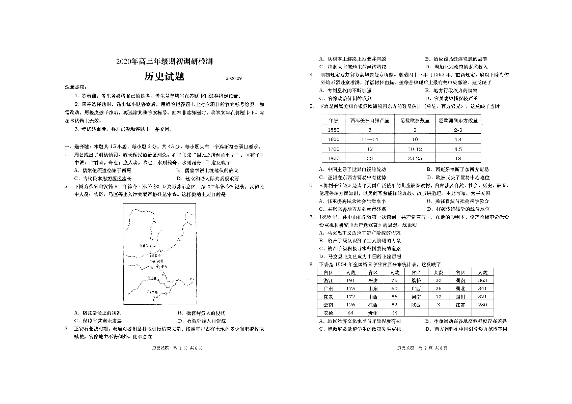 山东省青岛市2020.9高三年级期初调研检测试题历史