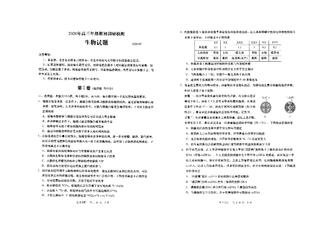 山东省青岛市2020.9高三年级期初调研检测试题生物