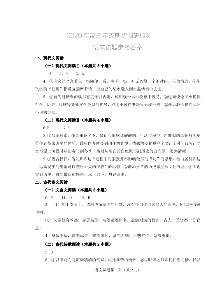 山东省青岛市2020.9高三年级期初调研检测试题语文答案