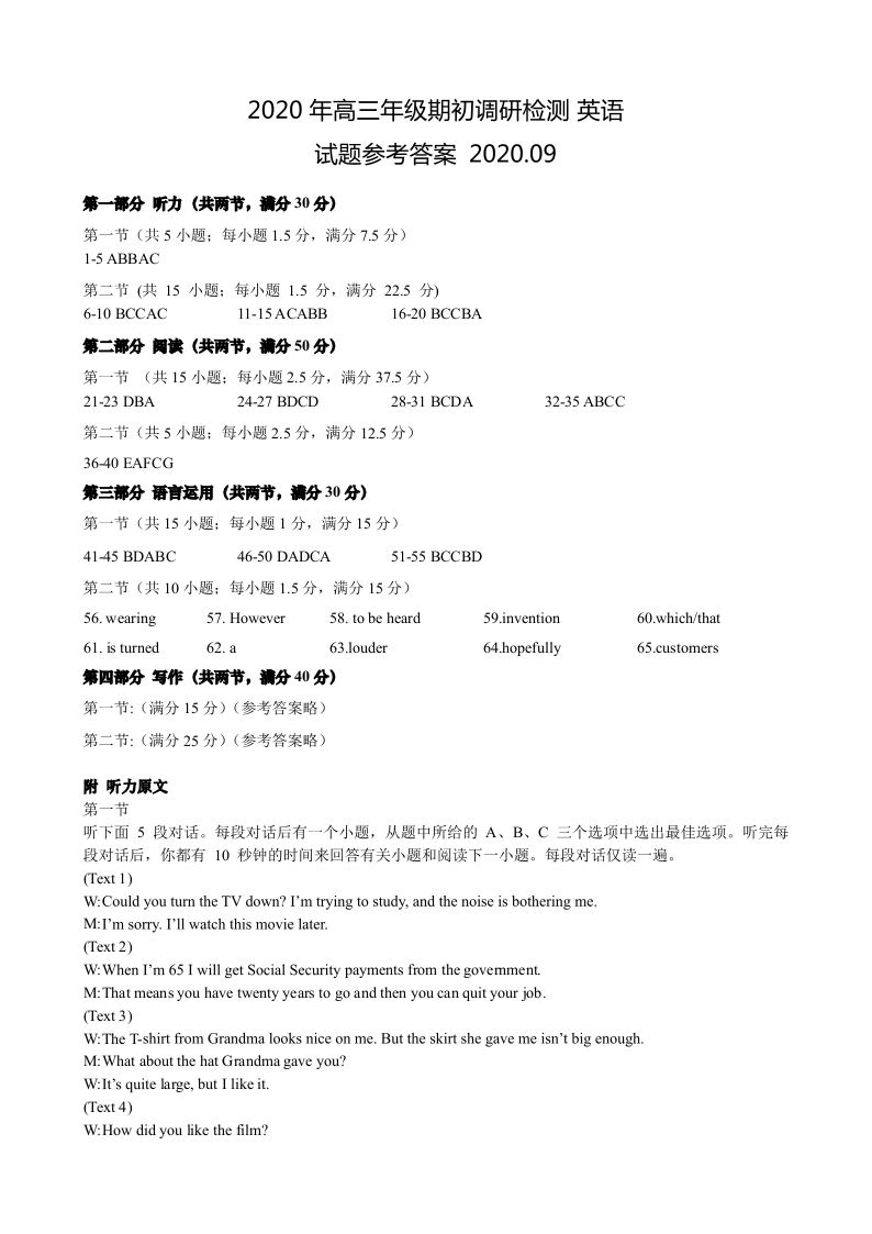 山东省青岛市2020.9高三年级期初调研检测试题英语答案