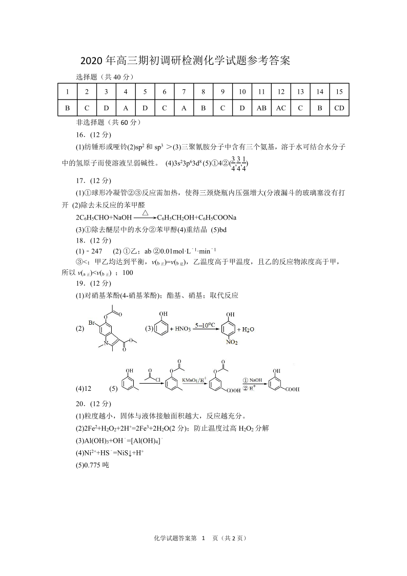 山东省青岛市2020.9高三年级期初调研检测试题化学答案