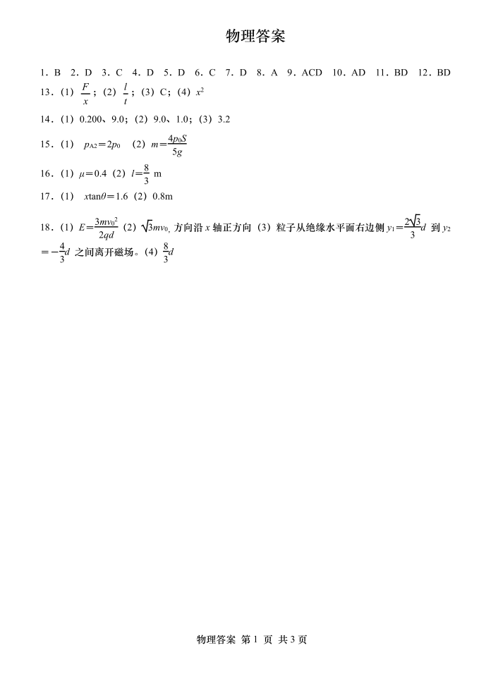 山东省青岛市2020.9高三年级期初调研检测试题物理答案