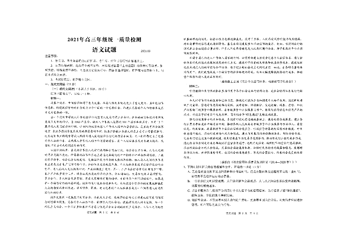 山东省青岛市2021.3高三年级第一次模拟考试语文