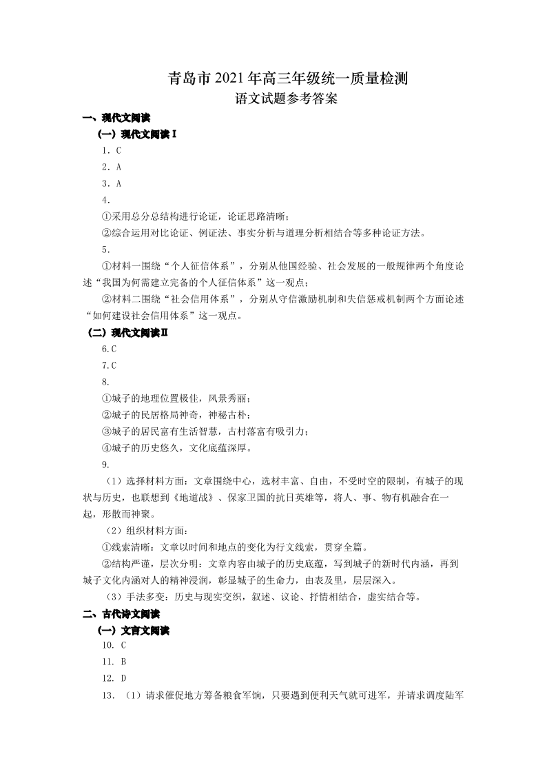 山东省青岛市2021.3高三年级第一次模拟考试语文答案
