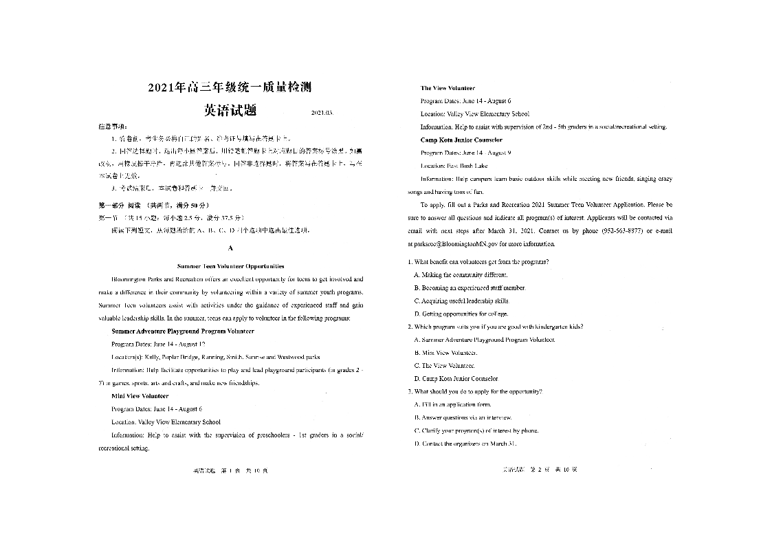 山东省青岛市2021.3高三年级第一次模拟考试英语