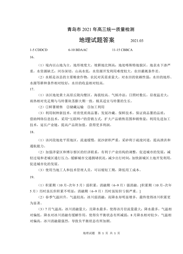 山东省青岛市2021.3高三年级第一次模拟考试地理答案