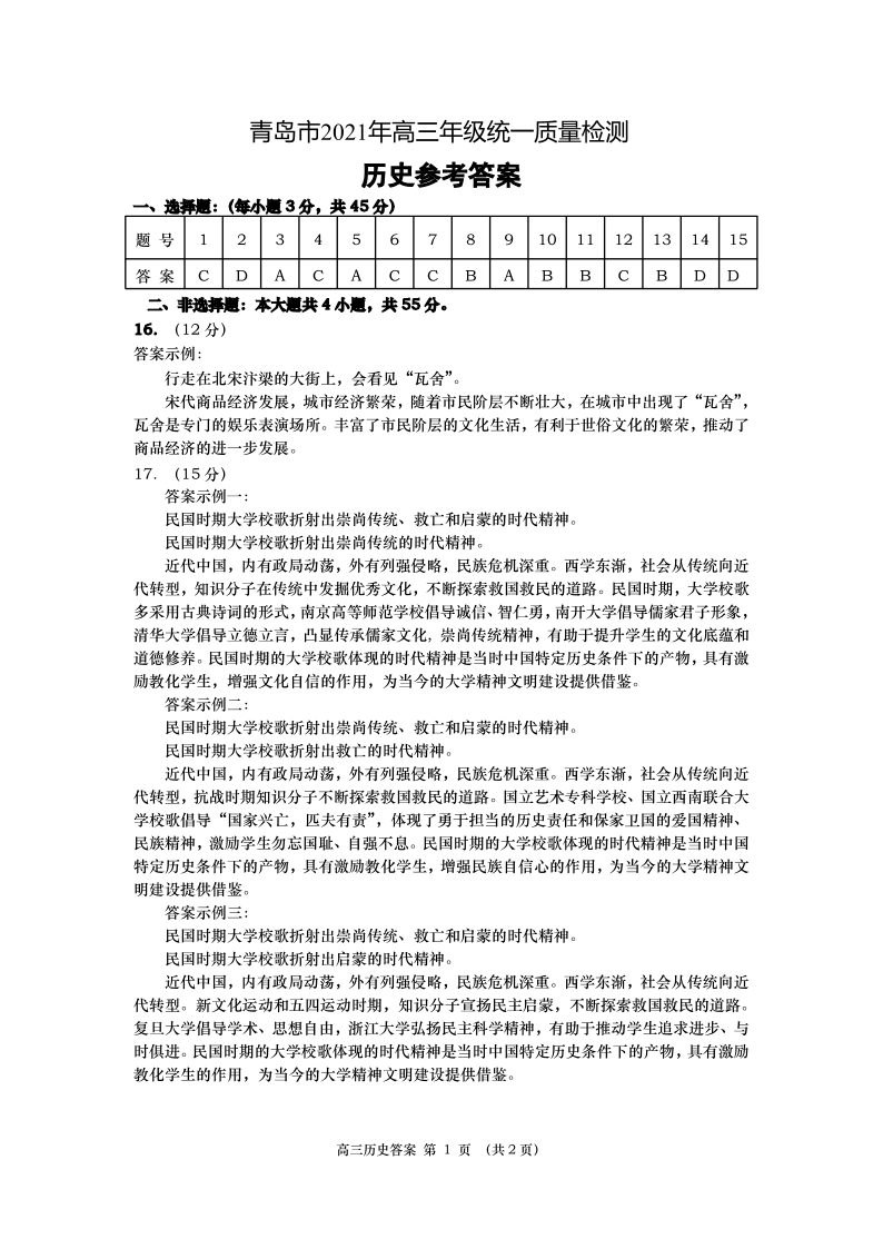 山东省青岛市2021.3高三年级第一次模拟考试历史答案
