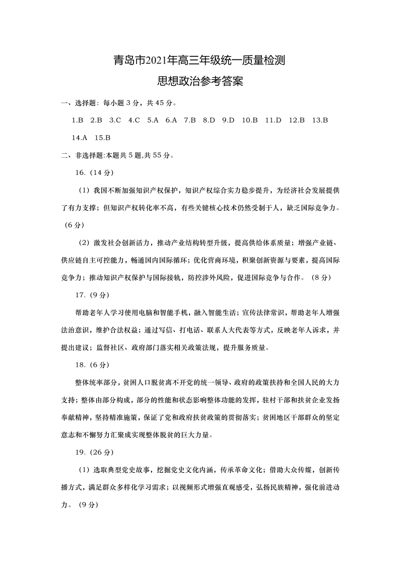 山东省青岛市2021.3高三年级第一次模拟考试政治答案
