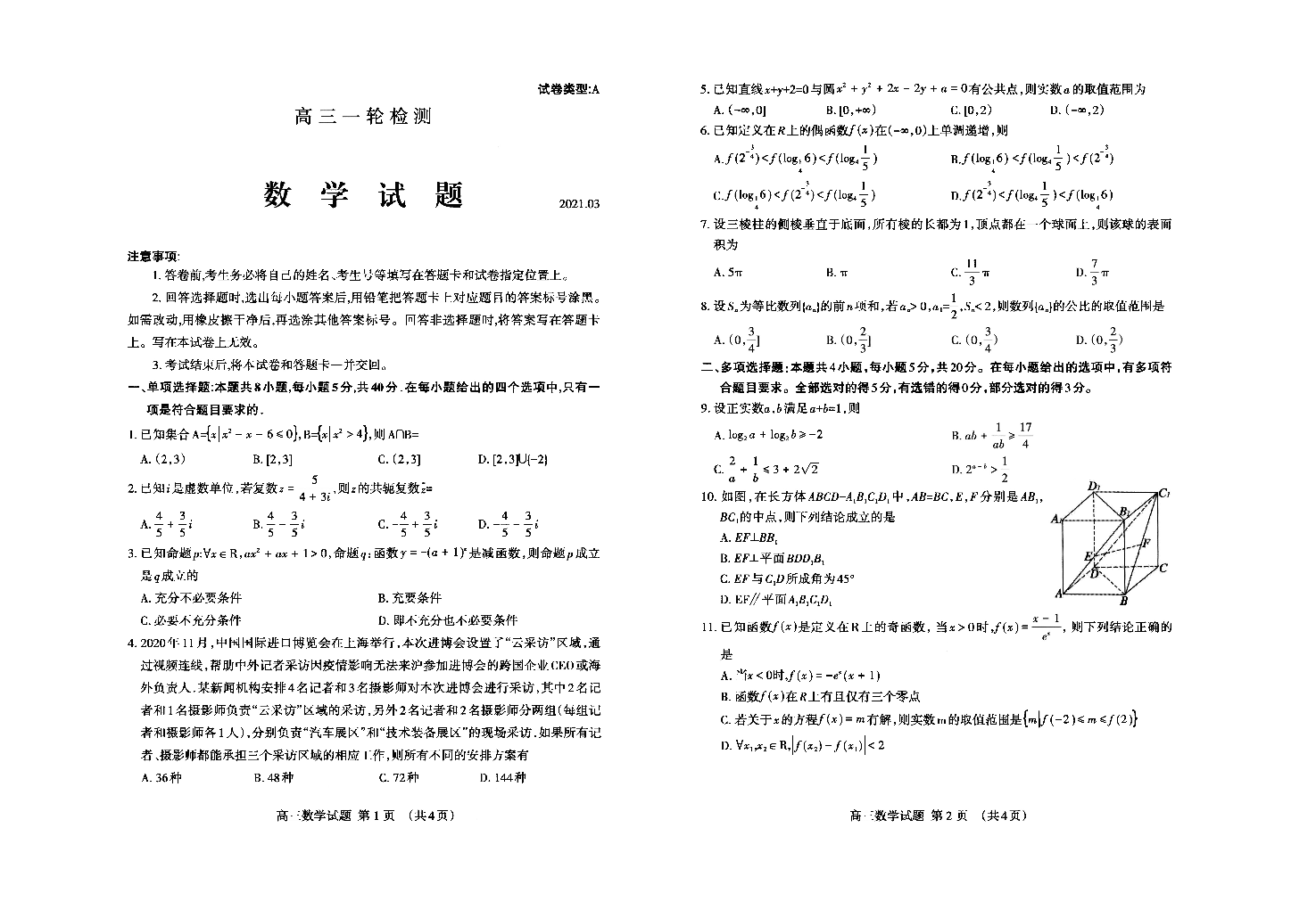 山东省泰安市2021.3高三年级第一次模拟考试数学