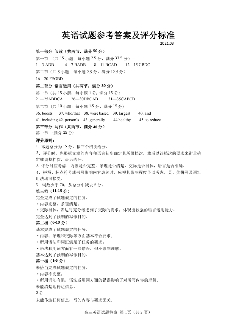 山东省泰安市2021.3高三年级第一次模拟考试英语答案