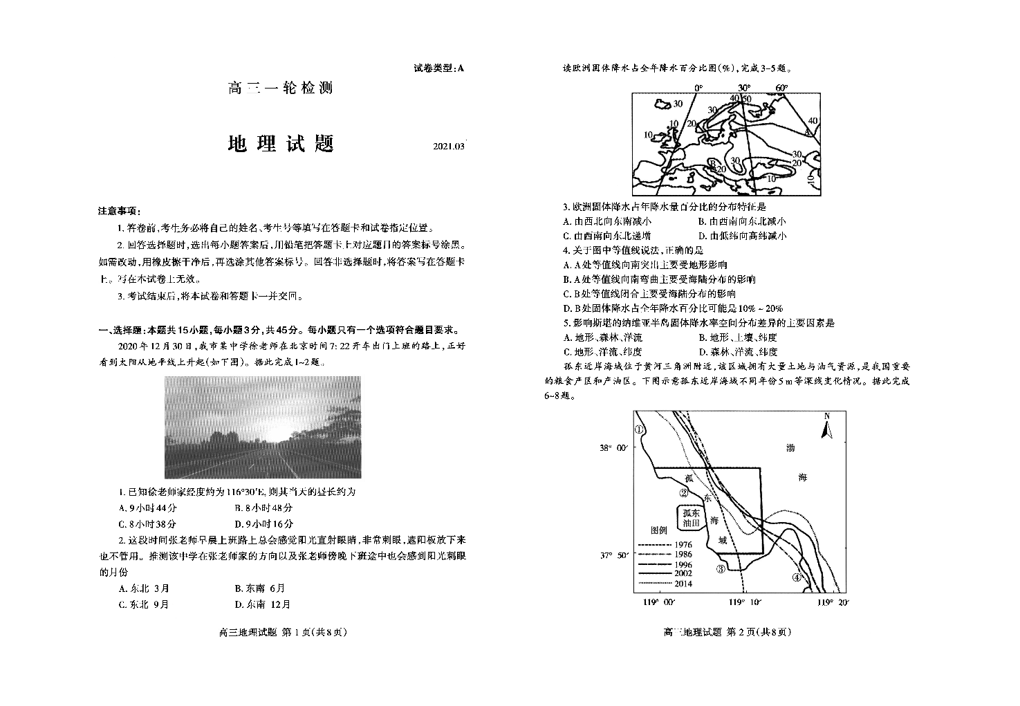 山东省泰安市2021.3高三年级第一次模拟考试地理