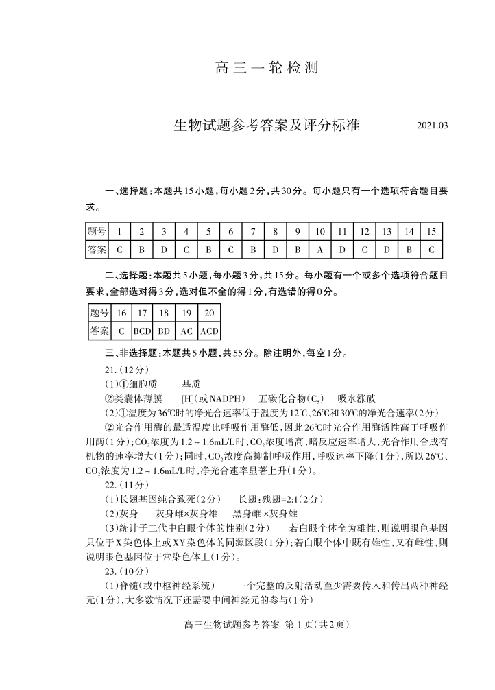 山东省泰安市2021.3高三年级第一次模拟考试生物答案
