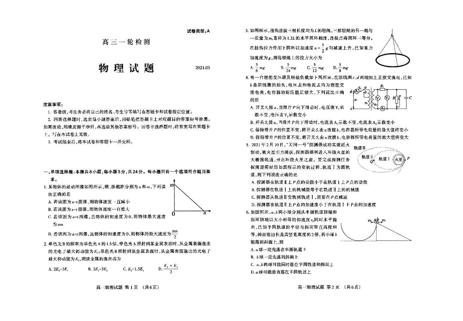 山东省泰安市2021.3高三年级第一次模拟考试物理