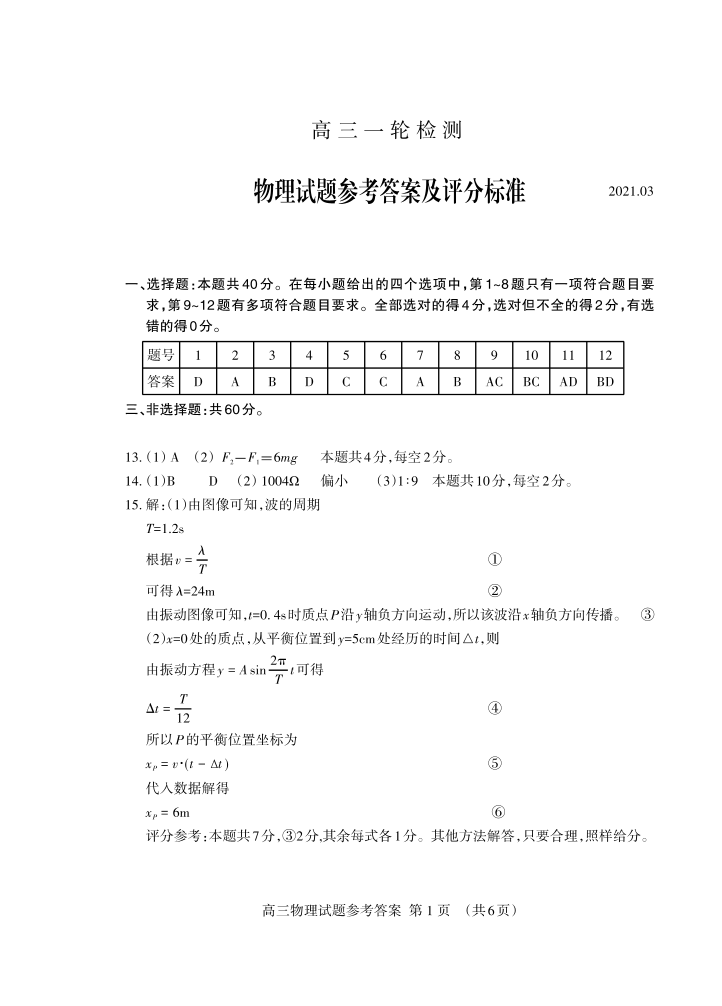 山东省泰安市2021.3高三年级第一次模拟考试物理答案