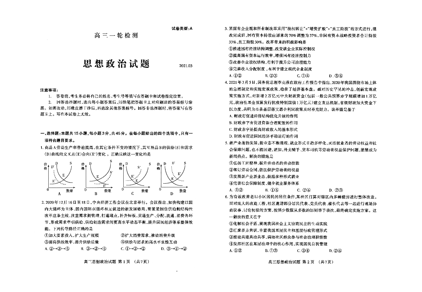 山东省泰安市2021.3高三年级第一次模拟考试政治