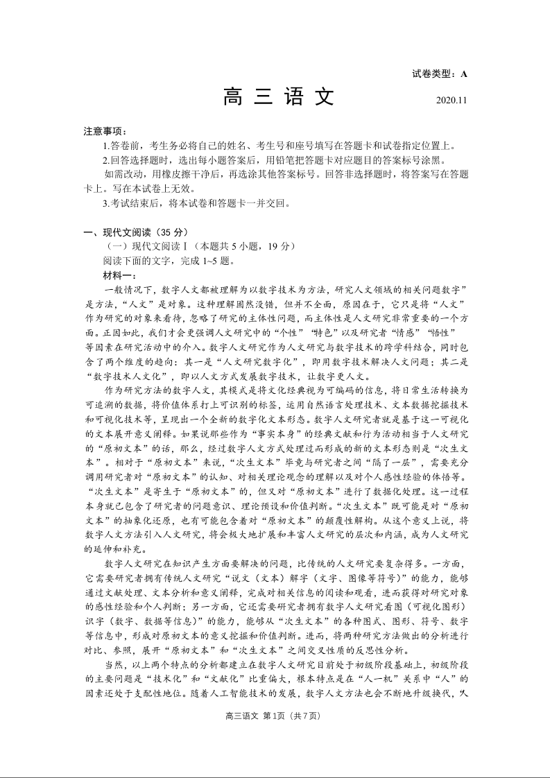 山东省潍坊市2020.11高三年级期中考试语文