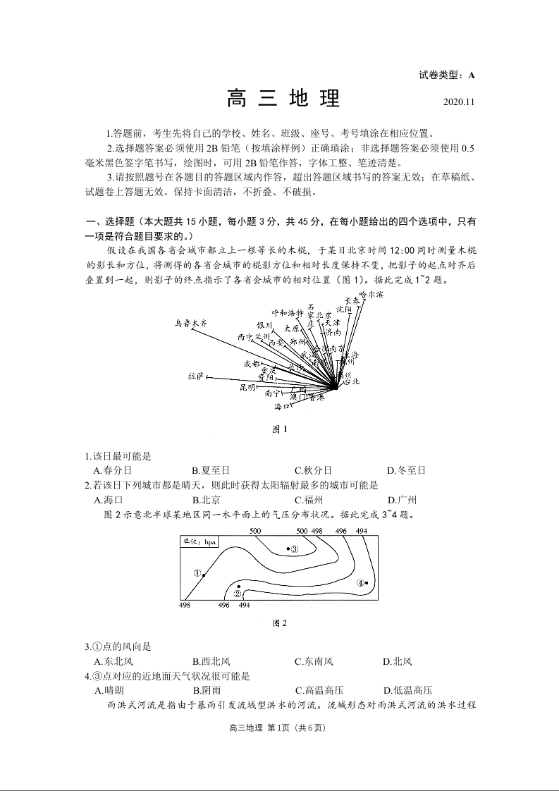 山东省潍坊市2020.11高三年级期中考试地理