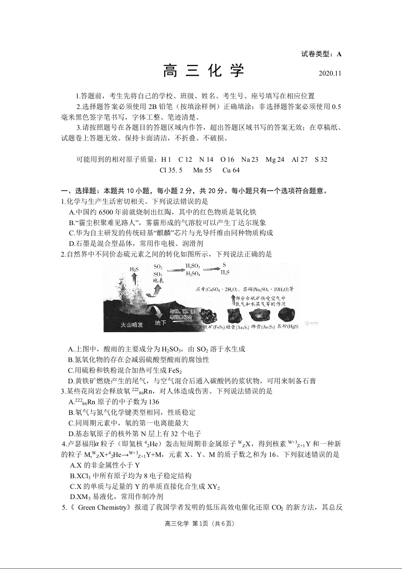 山东省潍坊市2020.11高三年级期中考试化学