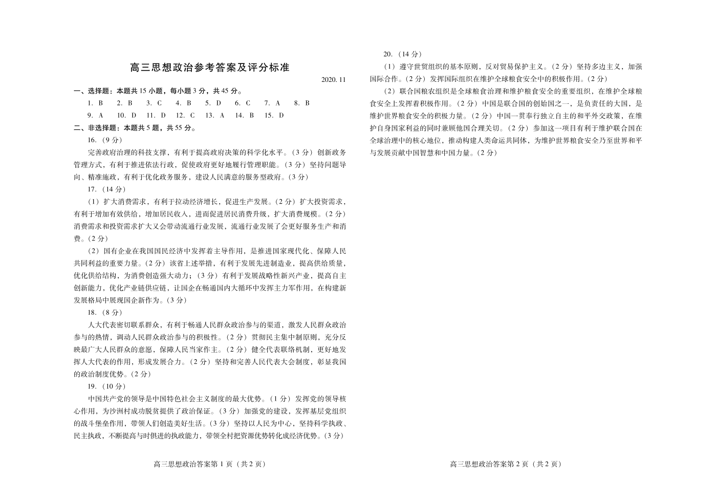 山东省潍坊市2020.11高三年级期中考试政治答案