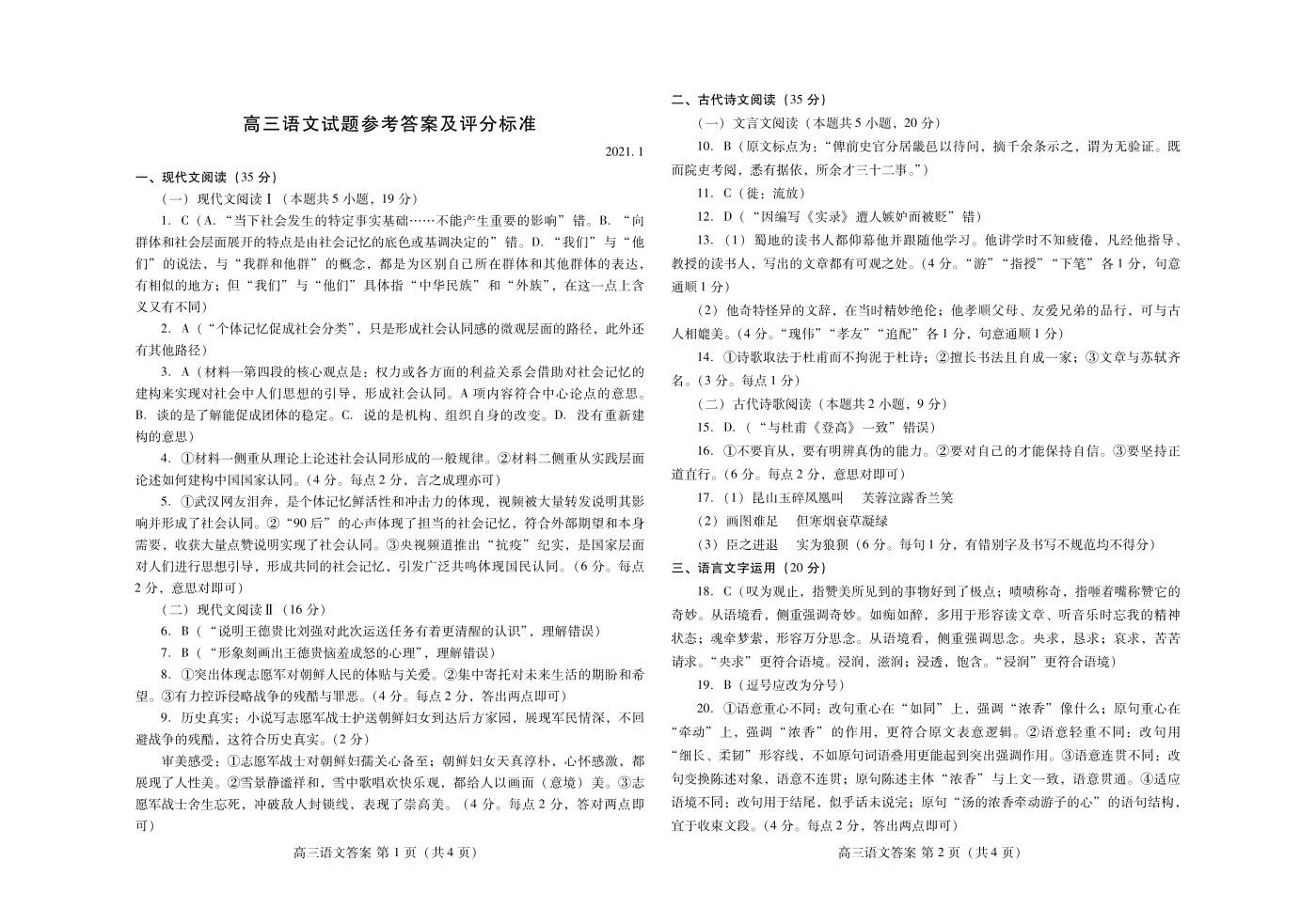 山东省潍坊市2021.1高三年级期末统考试题语文答案