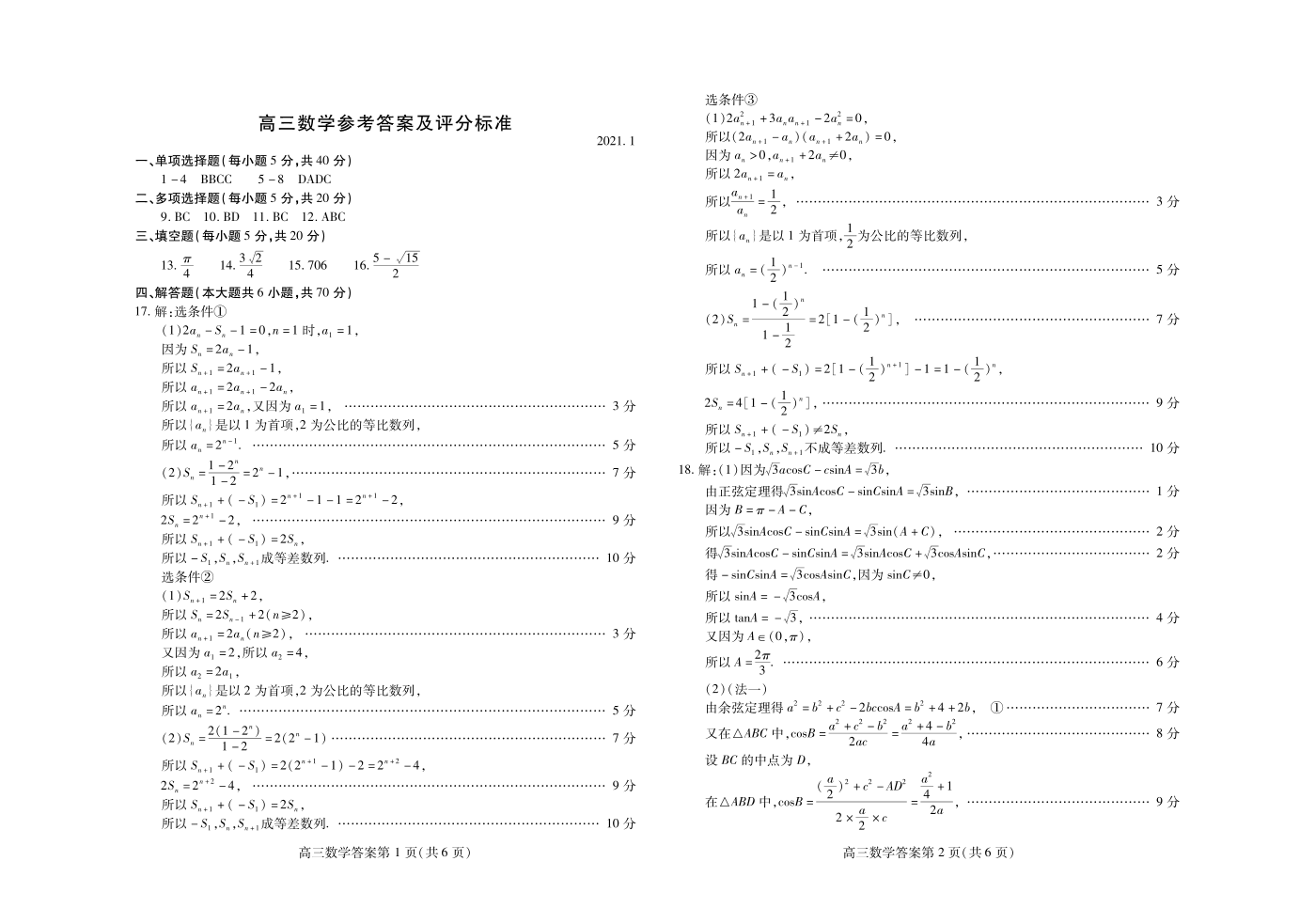 山东省潍坊市2021.1高三年级期末统考试题数学答案