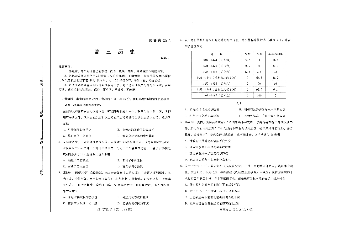 山东省潍坊市2021.1高三年级期末统考试题历史