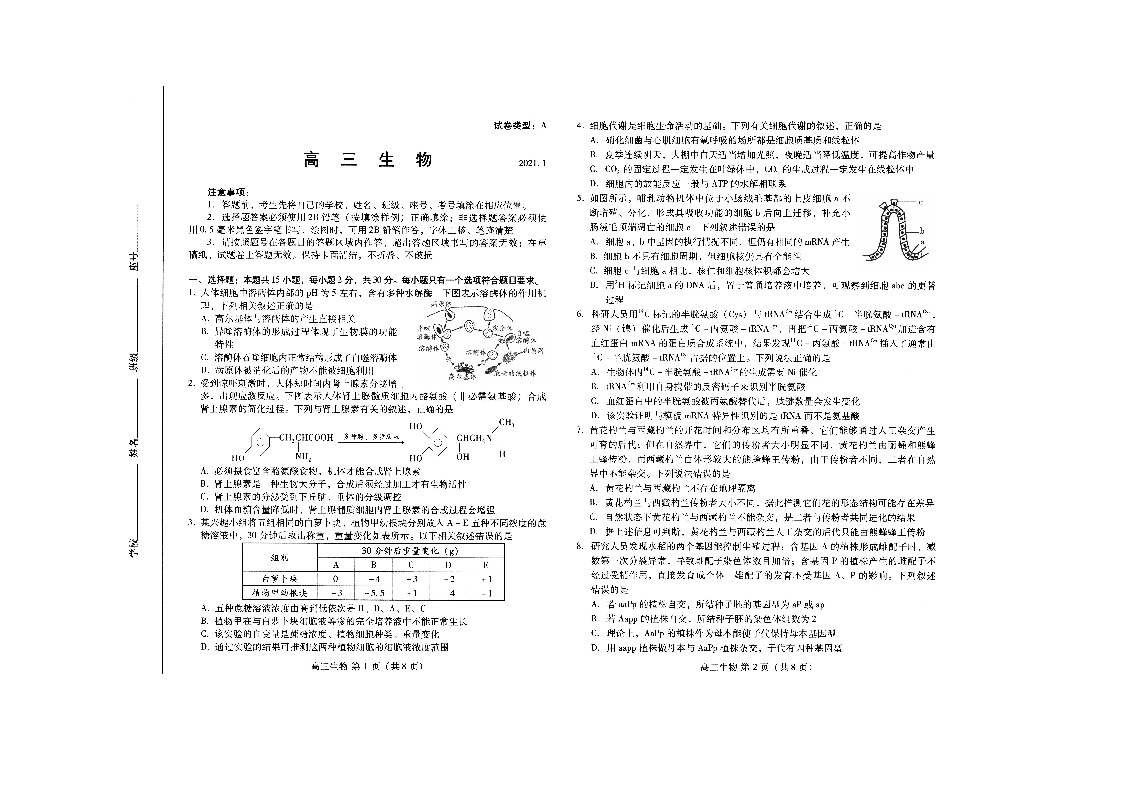 山东省潍坊市2021.1高三年级期末统考试题生物