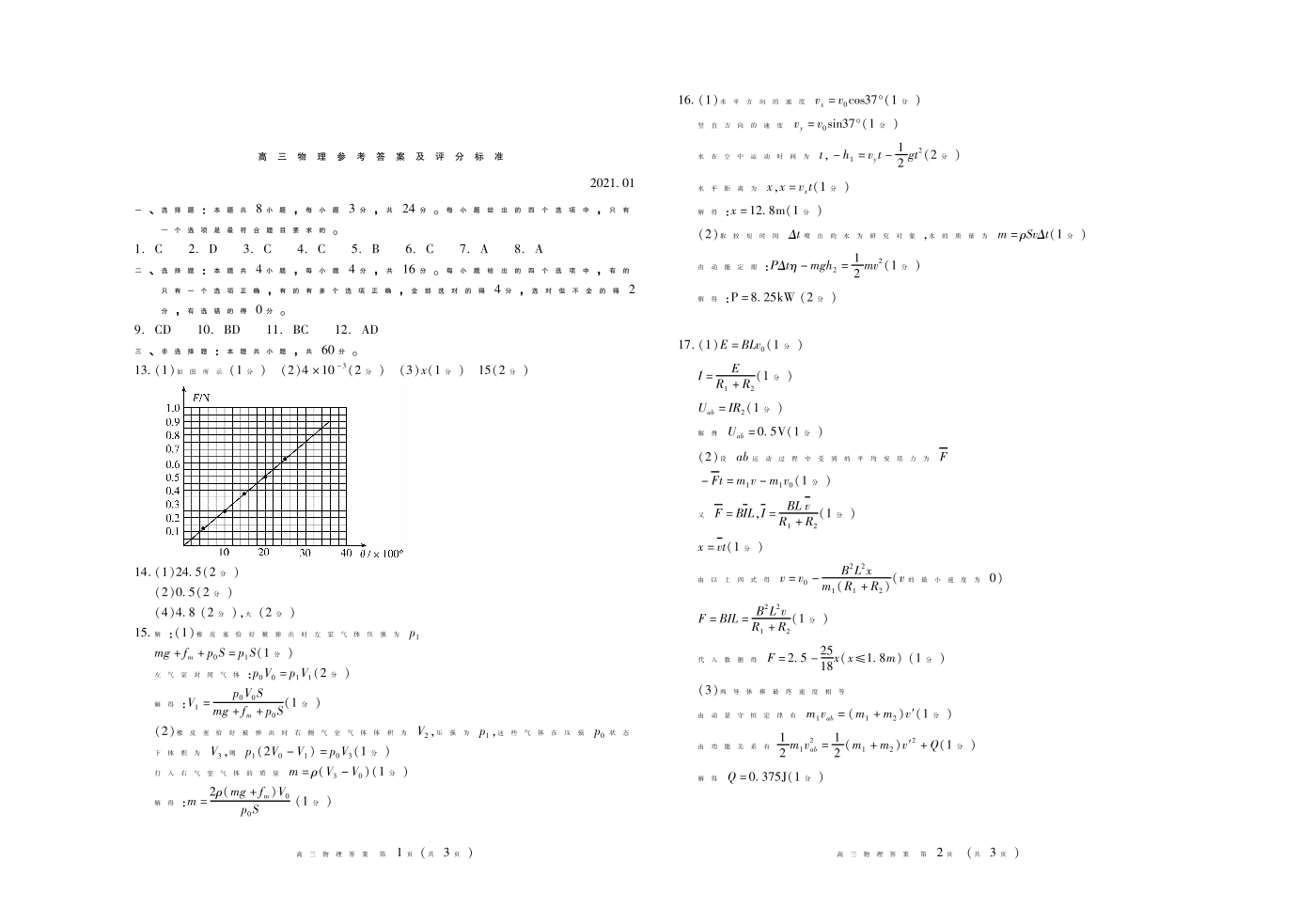 山东省潍坊市2021.1高三年级期末统考试题物理答案