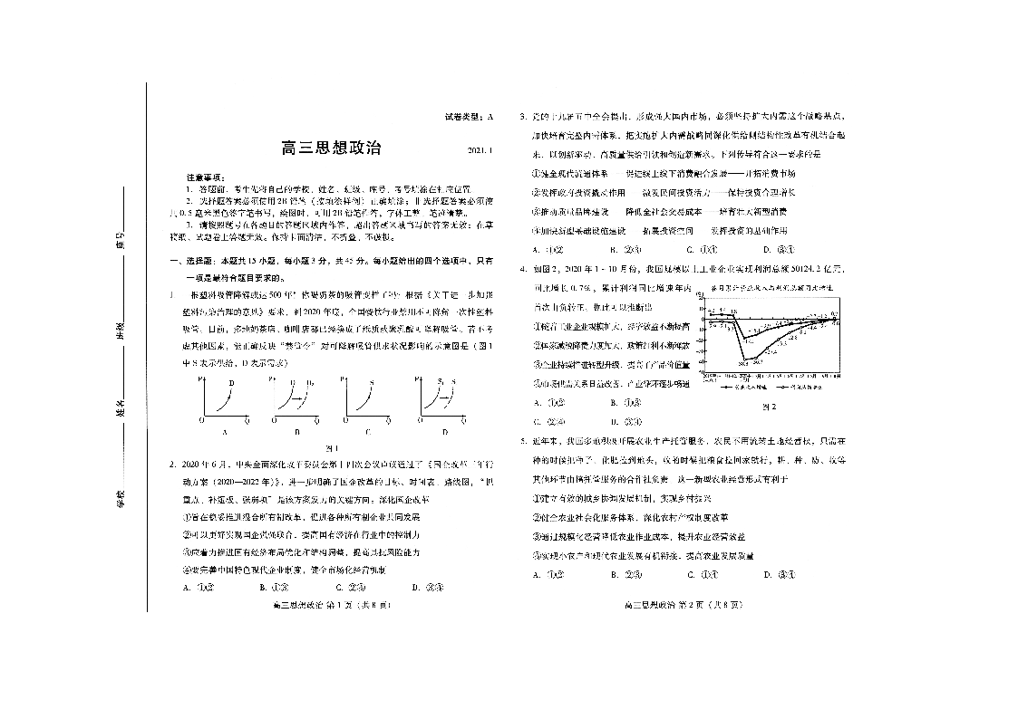 山东省潍坊市2021.1高三年级期末统考试题政治