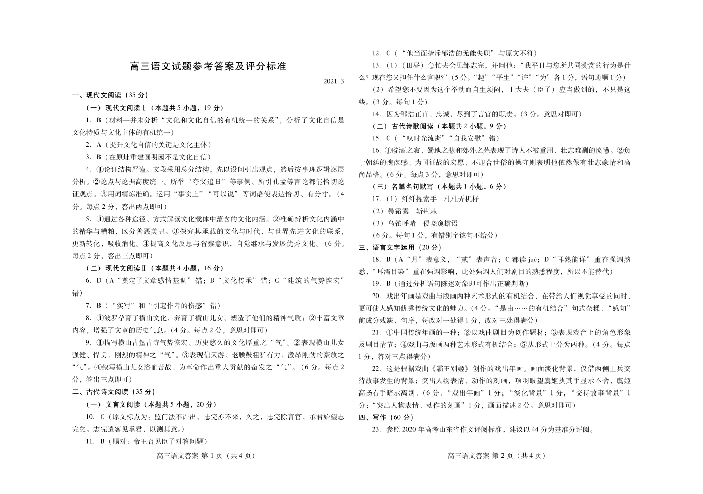 山东省潍坊市2021.3高三年级第一次模拟考试语文答案