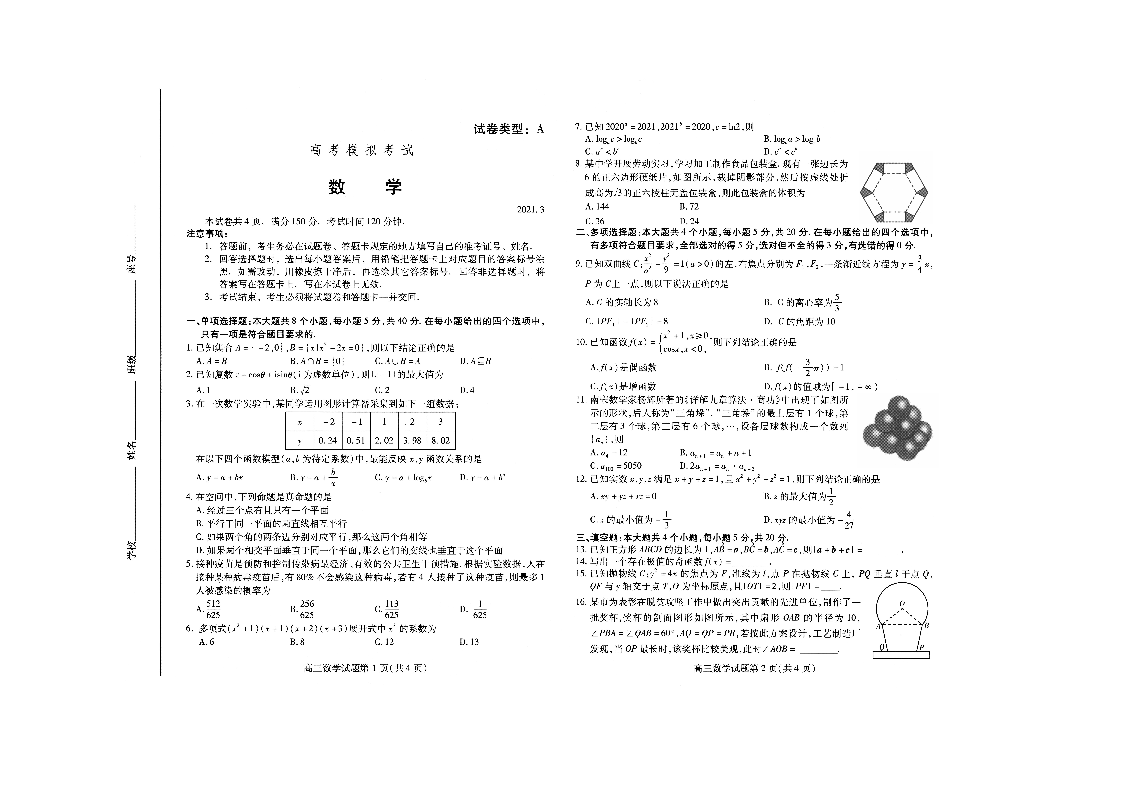 山东省潍坊市2021.3高三年级第一次模拟考试数学