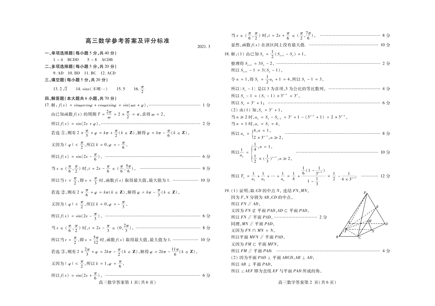 山东省潍坊市2021.3高三年级第一次模拟考试数学答案