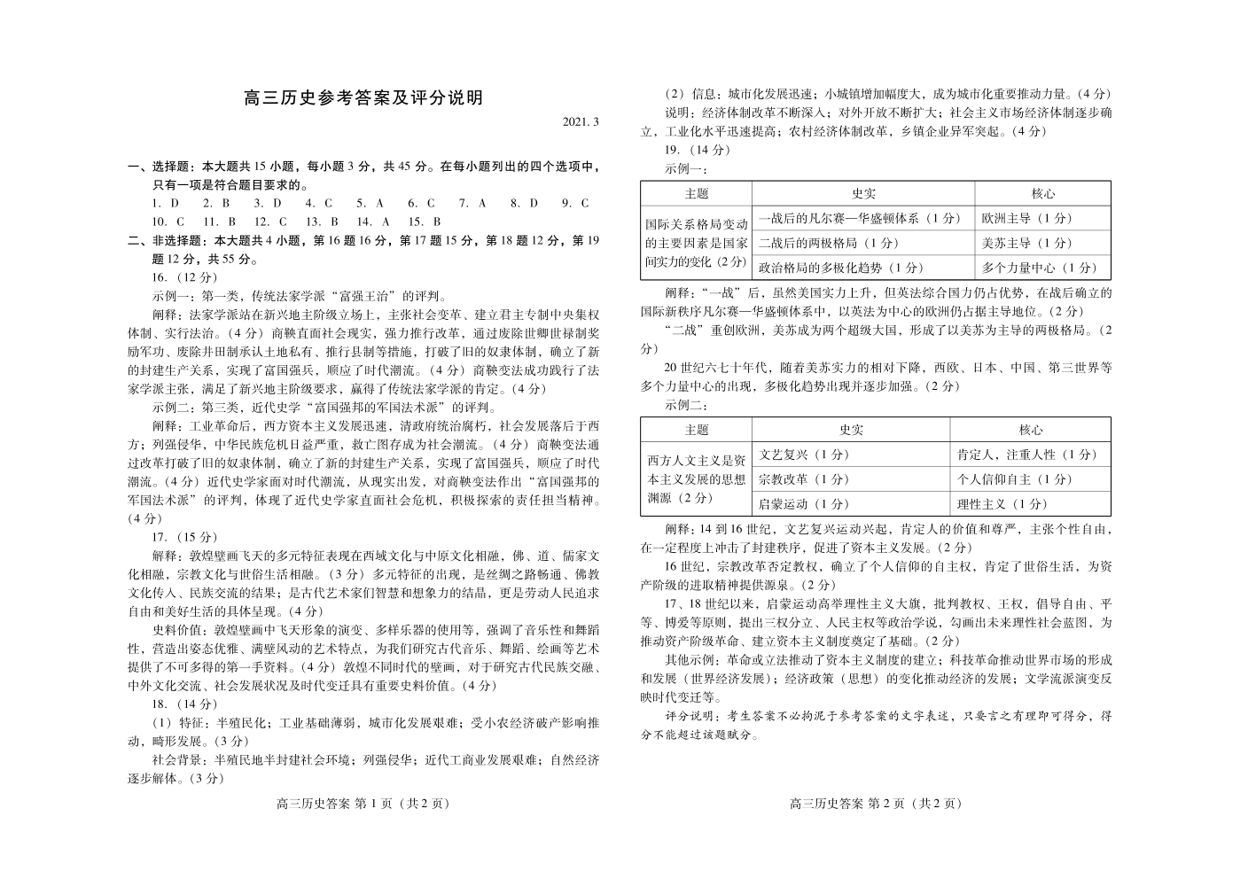 山东省潍坊市2021.3高三年级第一次模拟考试历史答案