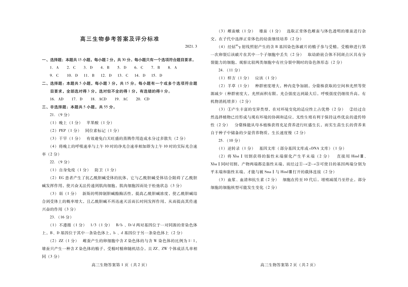 山东省潍坊市2021.3高三年级第一次模拟考试生物答案