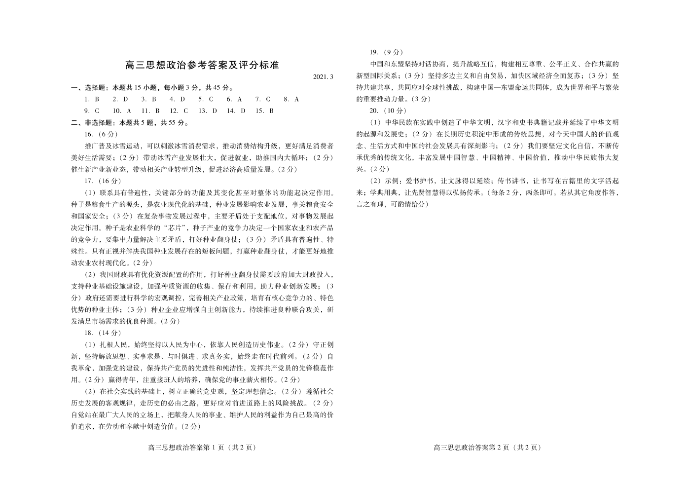 山东省潍坊市2021.3高三年级第一次模拟考试政治答案