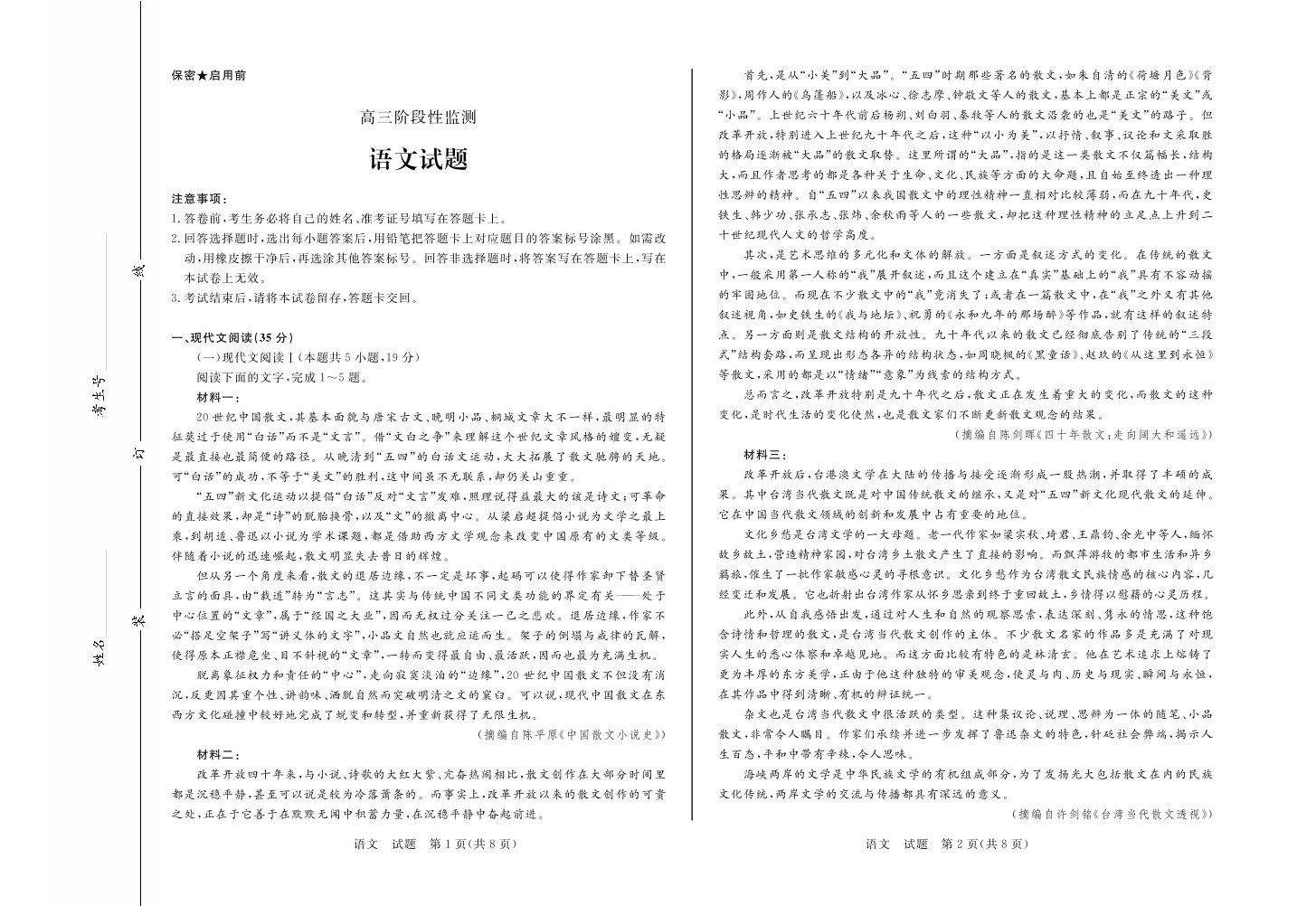 山东省潍坊市五县区2020.10高三年级阶段性监测试题语文