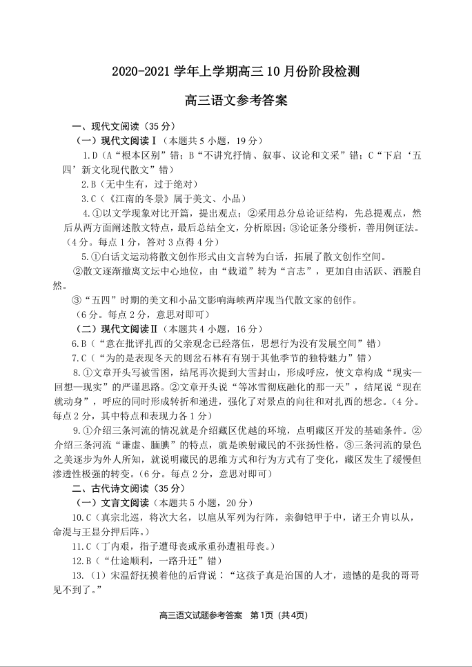 山东省潍坊市五县区2020.10高三年级阶段性监测试题语文答案